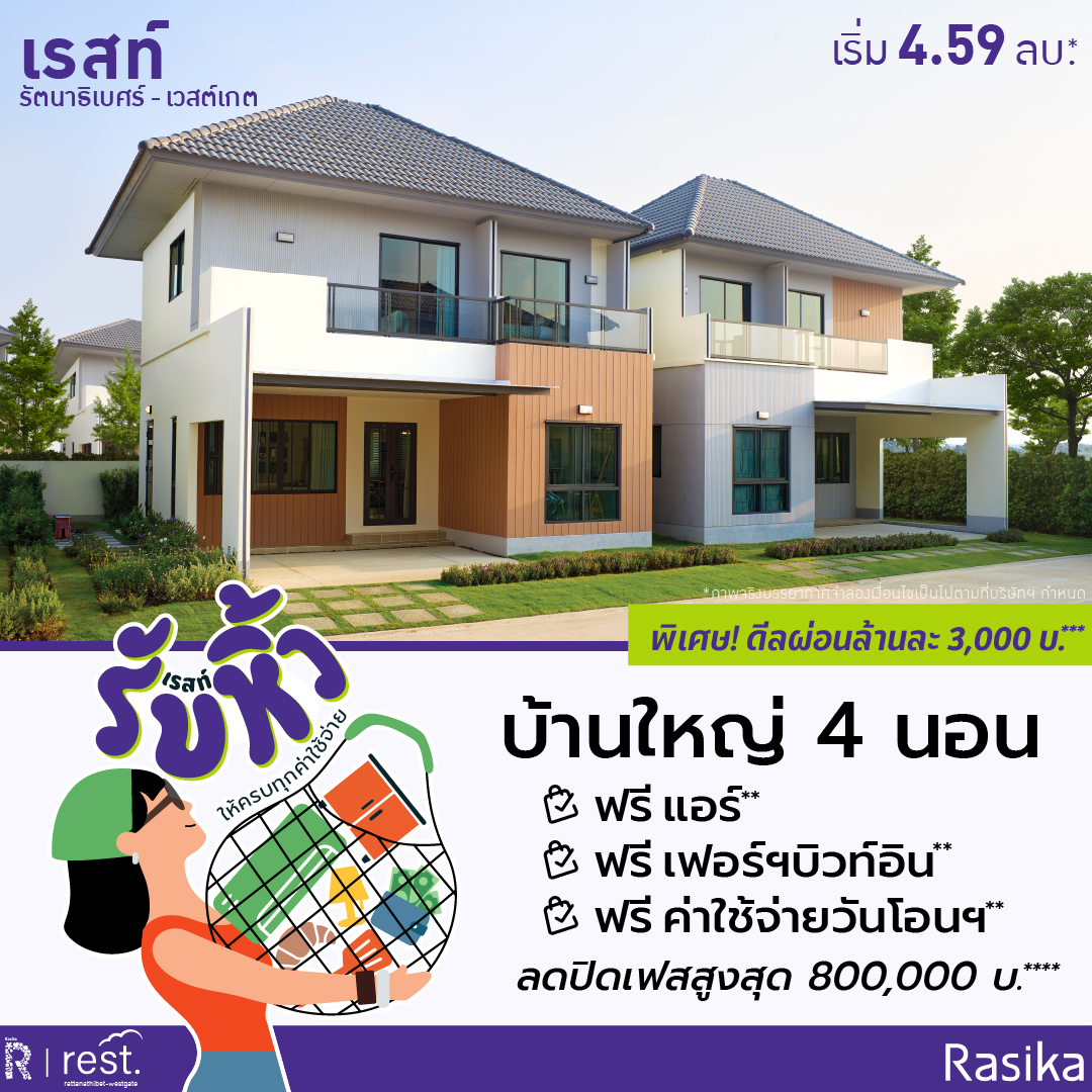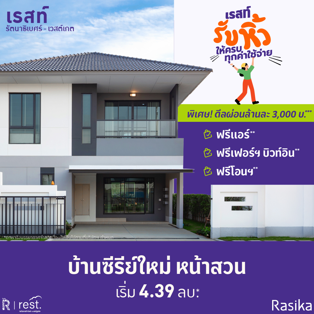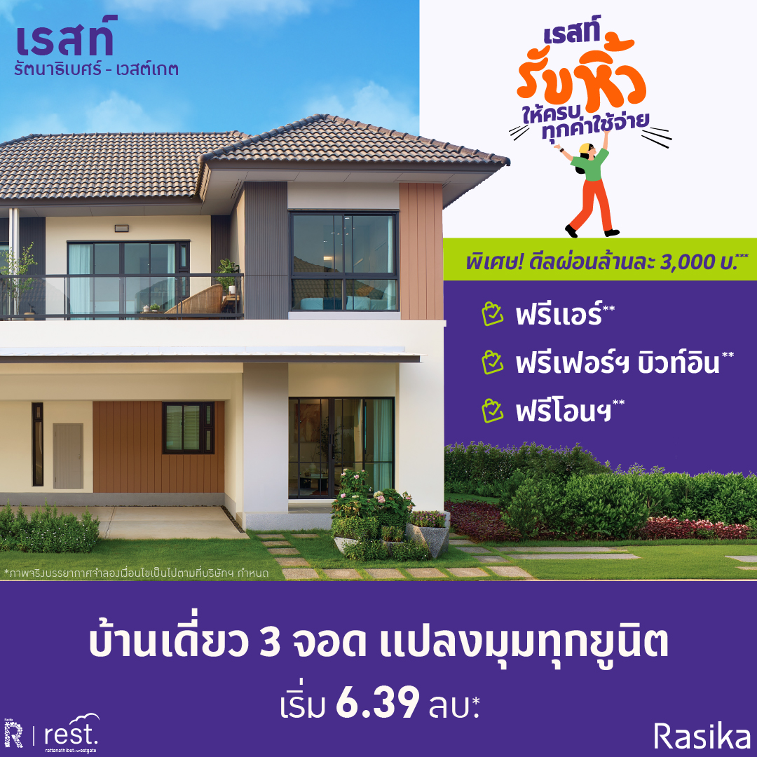 - โปรโมชั่น สําหรับผู้จองซื้อบ้านโครงการเรสท์ รัตนาธิเบศร์-เวสต์เกต ตั้งแต่วันที่ 1 เมษายน 2569 – 30 มิถุนายน 2569 และต้องรับโอนกรรมสิทธื์ภายใน 45 – 60 วันหลังการจองซื้อเท่านั้น