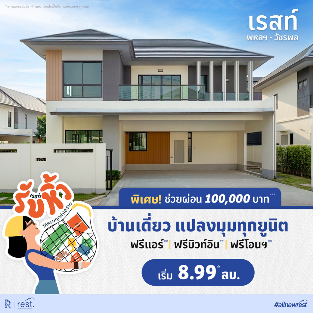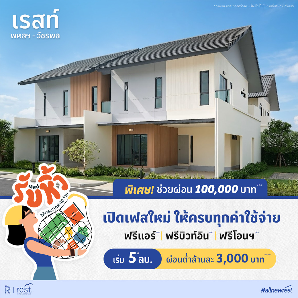 • โปรโมชั่น สําหรับผู้จองซื้อบ้านโครงการเเรสท์ พหลฯ-วัชรพล ตั้งแต่วันที่ 1 เมษายน 2569 – 30 มิถุนายน 2569 และต้องรับโอนกรรมสิทธื์ภายใน 45 – 60 วันหลังการจองซื้อเท่านั้น